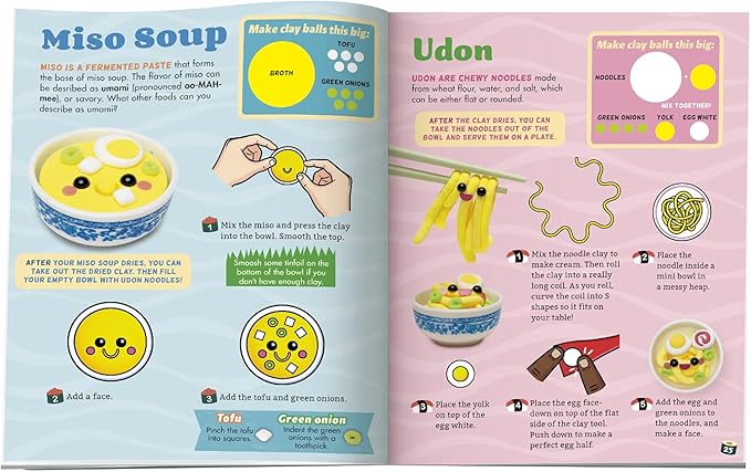 - 32-page book with crystal clear instructions for how to make 16 clay sushi treats