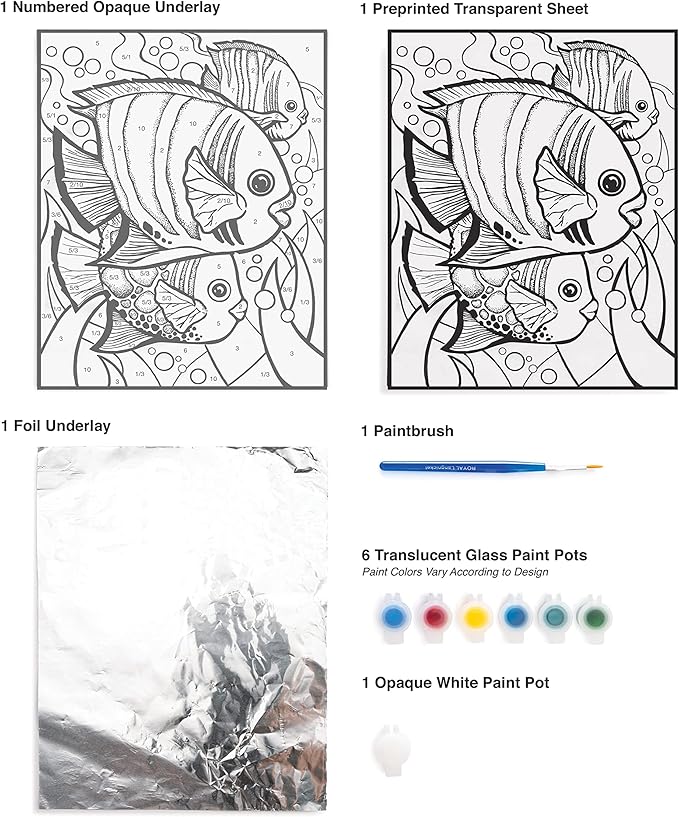 - Includes 6 translucent glass paint pots, 1 white paint pot, 1 numbered underlay, 1 transparency, 1 foil underlay and 1 paint brush