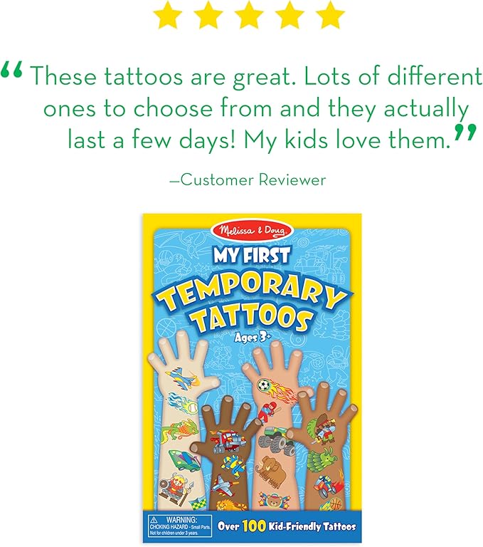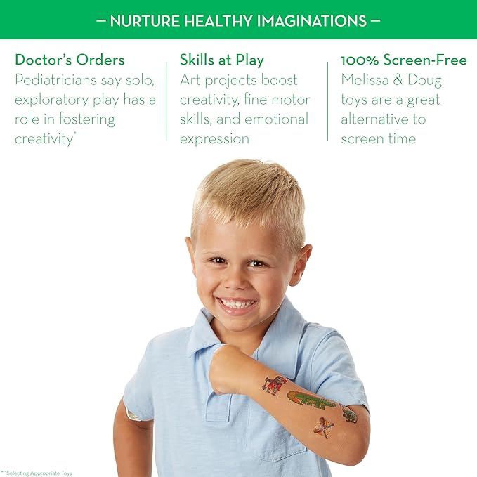 • GREAT GIFT FOR AGES 3 to 7: Melissa & Doug My First Temporary Tattoos make a delightful gift for kids ages 3 to 7. Add the Melissa & Doug Fashion Design Activity Kit to round out the hands-on play experience and to give kids an engaging option for screen-free fun.