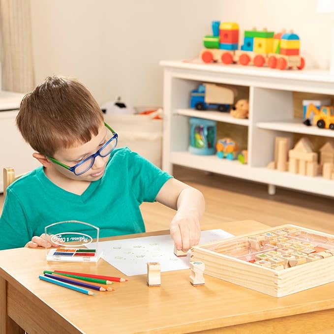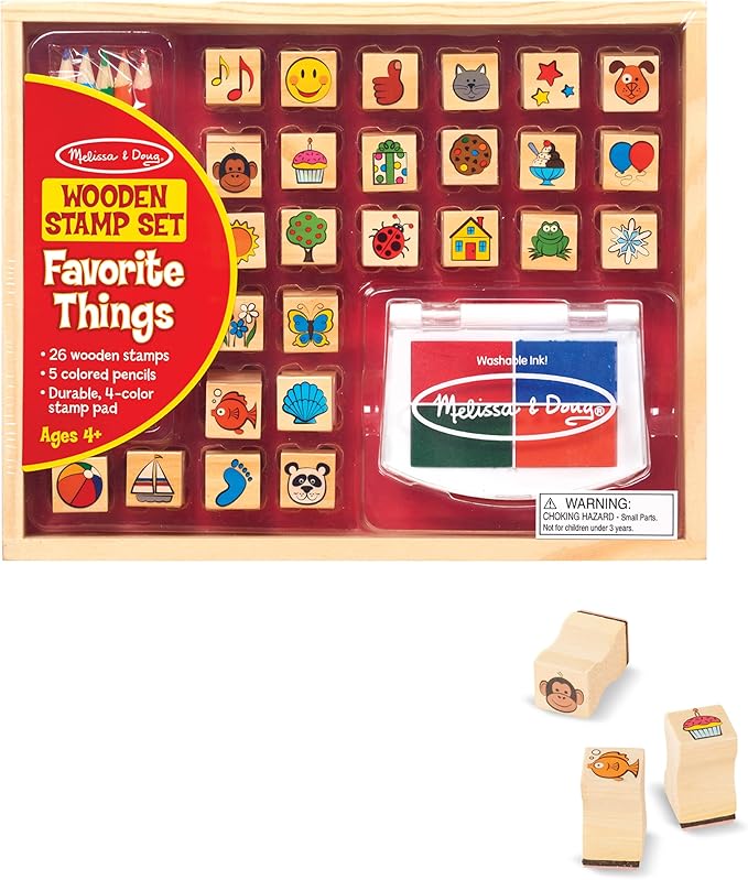 Melissa & Doug Wooden Stamp Set, Favorite Things - 26 Wooden Stamps, 4-Color Stamp Pad Kids Art Projects, Stamps With Washable Ink, For Kids Ages 4+