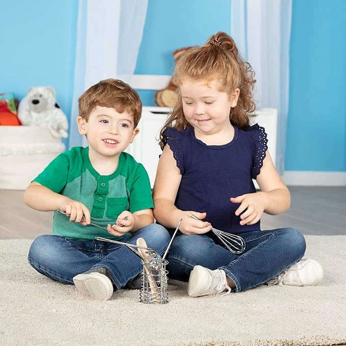 - 7-piece set includes pretend play whisk, ladle, spatula, slotted spoon, spaghetti server, wooden spoon, and holder