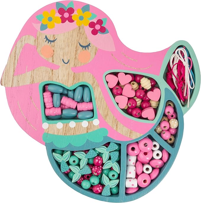 Stephen Joseph, Wooden Bead Kit for Kids, 125 Wooden Beads with 4 Necklace and 4 Bracelet Cords with Reusable Wooden Tray, Premium Wood Jewelry Making Kit for Kids, Mermaid