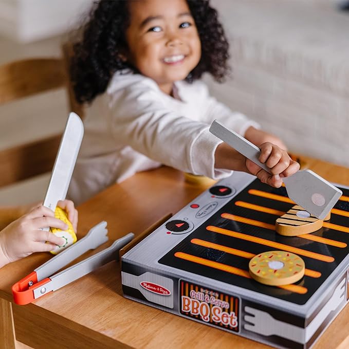 - 20-piece set with wooden food items to grill and prepare using pretend BBQ printed on back of sturdy corrugated storage box