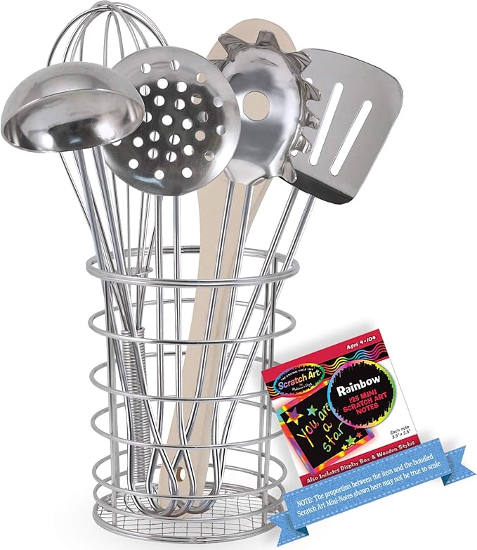 - 7-piece set includes: whisk, ladle, spatula, slotted spoon, spaghetti server, wooden spoon, and holder