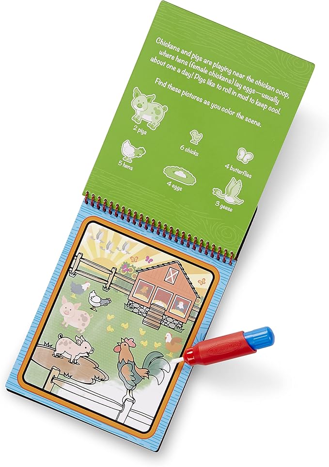 - CHUNKY-SIZED PEN: This Melissa & Doug farm life activity book comes with a chunky-sized water pen that allows easy filling and is designed for smaller hands to easily grasp. The compact, spiral-bound format is great for travel.
