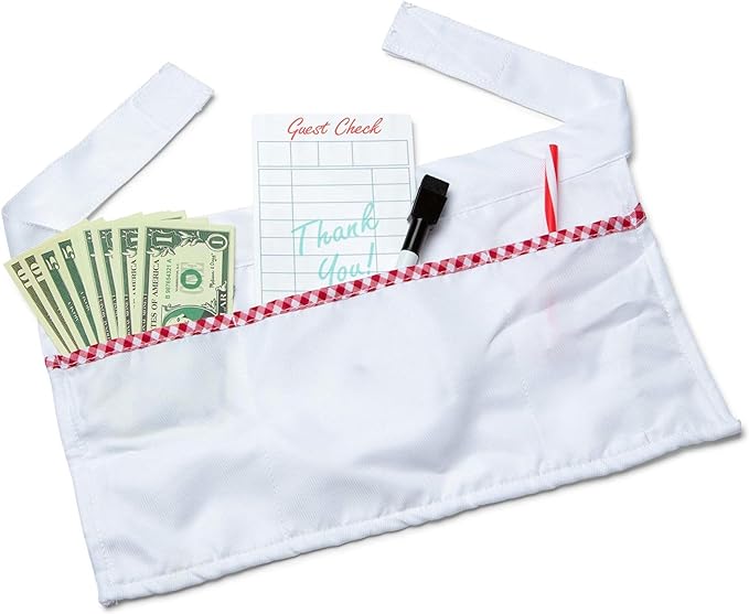 - Also includes fabric napkin, apron with pockets, working bell, menu, guest check, dry-erase marker, play money