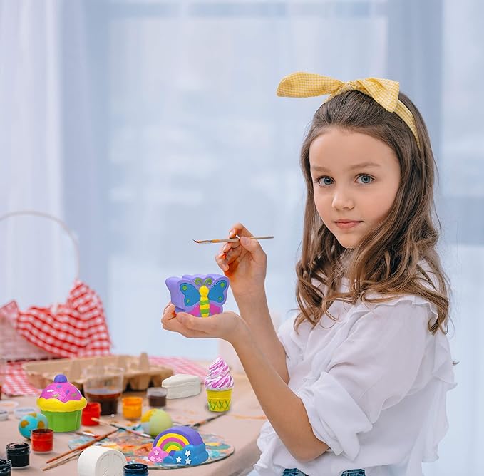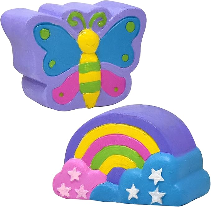 - PAINT PLASTER KIT – 6 Plaster Painting Figurines; Cupcake, Peace Symbol, Ice Cream, Butterfly, Cake, and Rainbow. Additionally, 6 Colors of Paint, Paint Brush, and Instructions How to Mix Colors ALL INCLUDED. A complete Painting Set your kids will love!