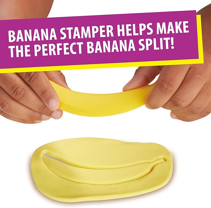 - Top it all off – create crazy banana splits with the banana stamper. The decorating tool has 3 rails that squeeze Play-Doh compound in 9 different shapes for wacky whipped cream and other toppings.