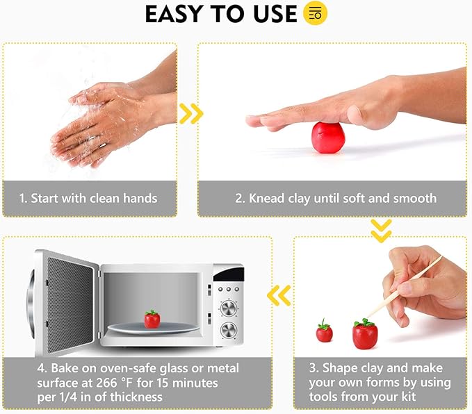 - 【Three Stereotypes Methods】Oven Bake (Recommended), Boil method (suitable small works size in 1/3 inch) and Hair Blower Heating (Suitable small works size in 1-2 inch).