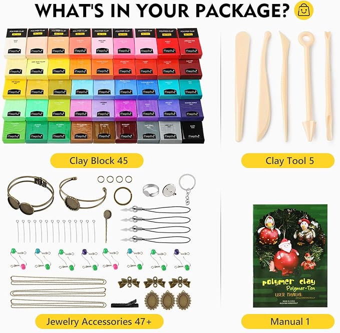 Magicfly Polymer Clay Starter Kit, 45 Colors Oven Bake Clay with 5 Modeling Tools and 40 Jewelry Accessories, Safe and Nontoxic DIY Baking Clay Blocks