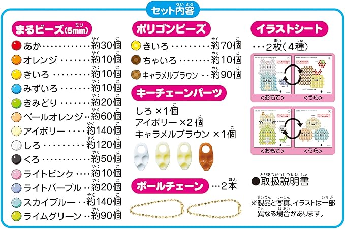 - Set Includes: Polygon beads (3 colors), illustration sheet (4 types x 2), ball chain (2 pieces), key chain parts (pewter x 1, ivory x 2, caramel brown x 1), instruction manual (1 piece)