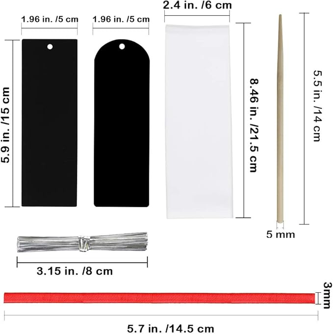 - Dimensions: Magic Scratch Rainbow Bookmarks measure appr. 5.9" in length and 2" in width. Scratch Wood Sticks: 5.7" in length. Satin ribbons: 5.5" in length and 3mm in width. Clear Cellophane Bags: 7.9" x 2.4" (LXW). Twist ties: 3.1" in length.