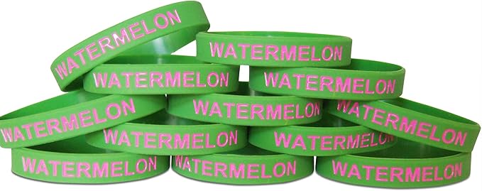 - WATERMELON GREEN DESIGNS This pack contains 12 of the watermelon wristband design with color green, for a total of 12 fruit bracelets. This party favor pack is the prime mini size for goodie bag fillers for any fruit themed party.