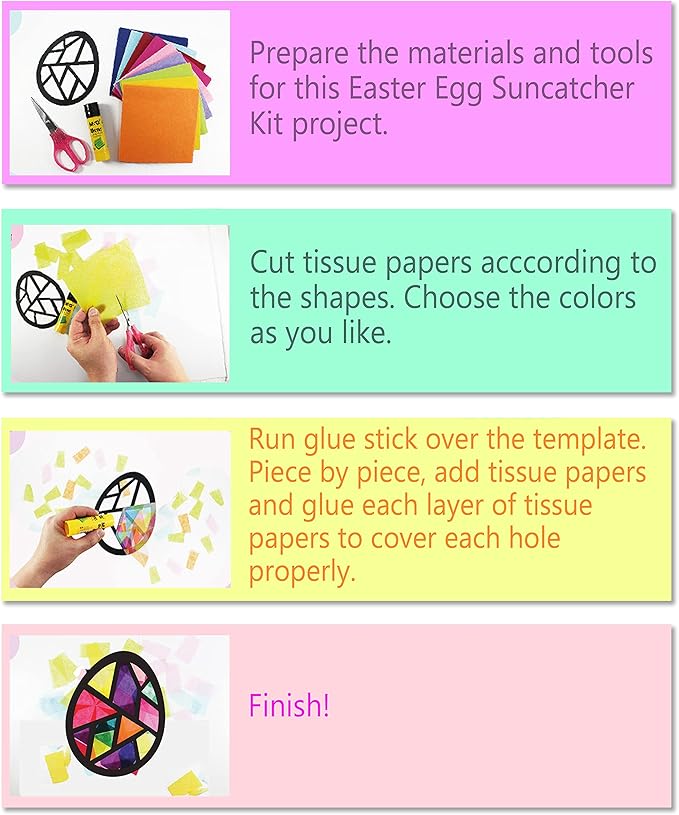 - [SUNCATCHER CRAFT – EASTER EGG] Includes 3 Sets of 3 Precut Easter Egg Templates and 3 Sets of 9 Assorted Color Tissue Papers.
