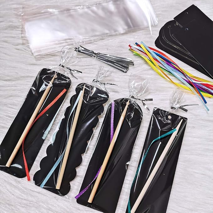 - Quantity: Package includes 36 Pcs 4 Style Magic Art Rainbow Scratch Paper Bookmarks DIY Bookmarks, 36 pcs Scratch Paper Stylus Wood Sticks, 36 pcs Satin Ribbons in red, 36 pcs Clear Plastic Cellophane Bags and 36 pcs Twist Ties in silver.