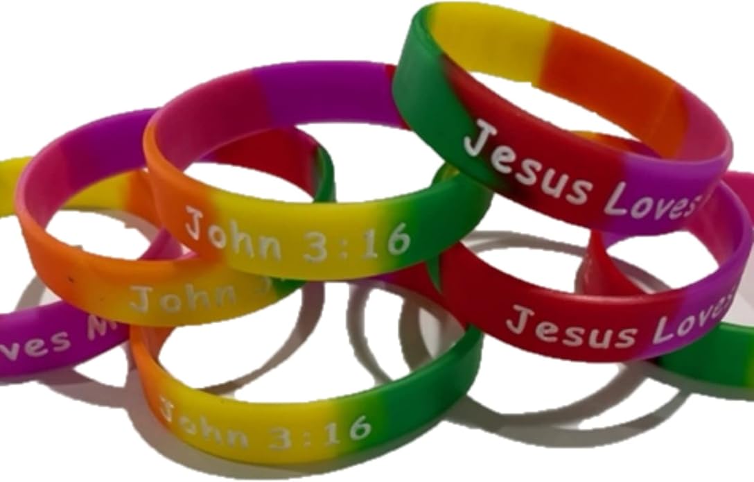 - For Small Wrists. Get 100 count of Jesus loves me youth Christian silicone rubber bracelets in bright and beautiful colors including purple, yellow, orange, pink, green, and red. These top-quality bracelets are thick and not flimsy like other brands, and are ink injected to ensure that the letters won't wear off over time. Use them for Vacation Bible School (VBS), church camp, Sunday school, field trip identification. They are 7" in size, and make great prizes and giveaways.