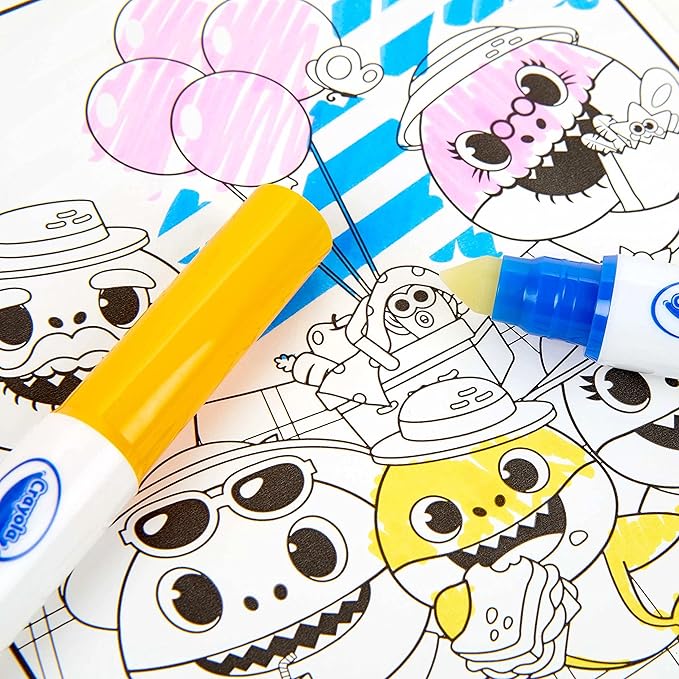 - BABY SHARK COLOR WONDER: Includes 16 Color Wonder Coloring Pages, 3 Mini Color Wonder Markers, and built-in marker storage.