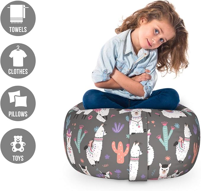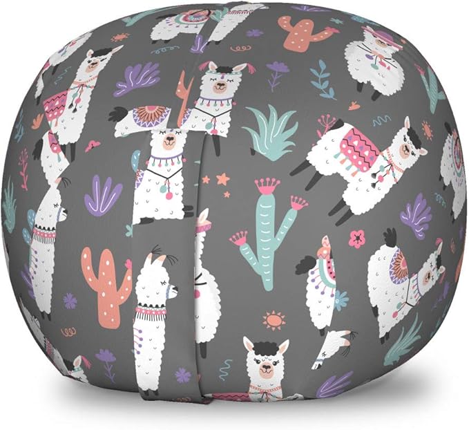 Lunarable Alpaca Storage Toy Bag Chair, Happy Cartoon Illustration of in Ornaments and Motifs Traditional, Stuffed Animal Organizer Washable Bag, Small Size, Grey White