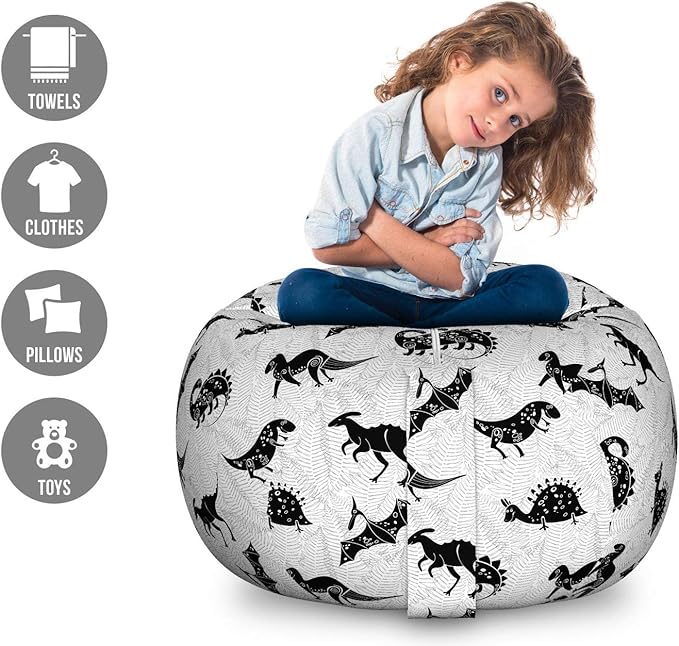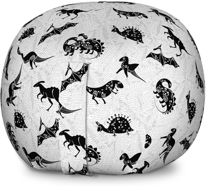 Lunarable Dinosaur Silhouette Storage Toy Bag Chair, Abstract Design Prehistoric Jurassic Animal on Leaves, Stuffed Animal Organizer Washable Bag, Large Size, Charcoal Grey