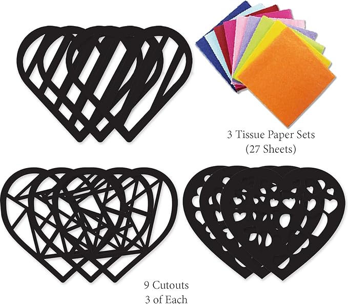 - [SUNCATCHER CRAFT – HEART] Includes 3 Sets of 3 Precut Heart Templates and 3 Sets of 9 Assorted Color Tissue Papers.