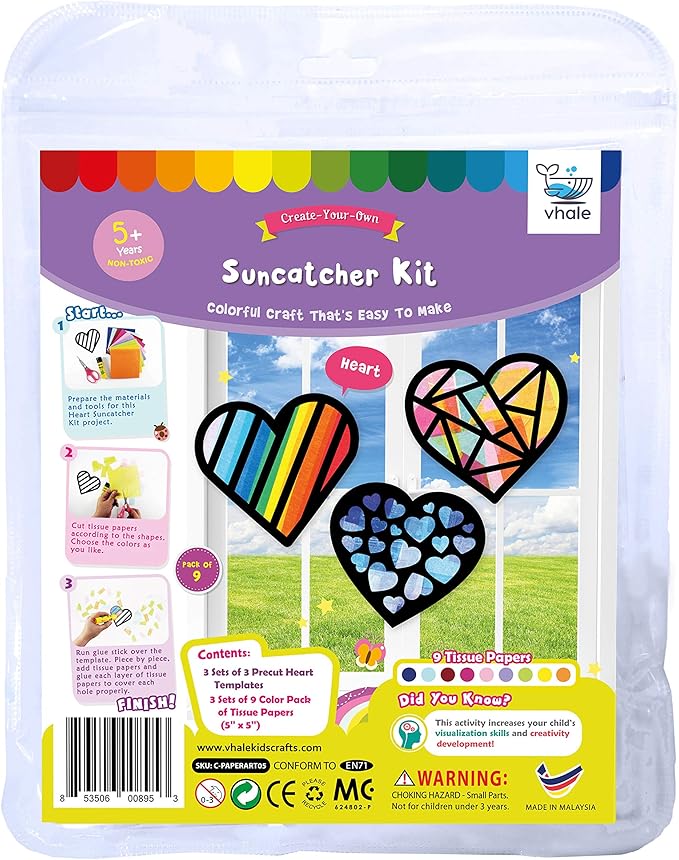 - [FEATURES] This easy and simple create your own kit contains everything needed to design and make Heart themed suncatchers. With Heart precut templates and plenty of colorful tissue paper, this suncatcher kit is guaranteed to brighten your day.