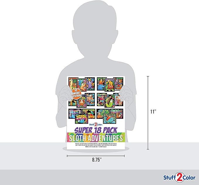 Stuff2Color Super Pack of 18 Fuzzy Velvet Coloring Posters (Sloth Adventures) - Arts & Crafts for Girls and Boys - Great for After School, Travel, Planes, Group Activities, and Coloring with Friends
