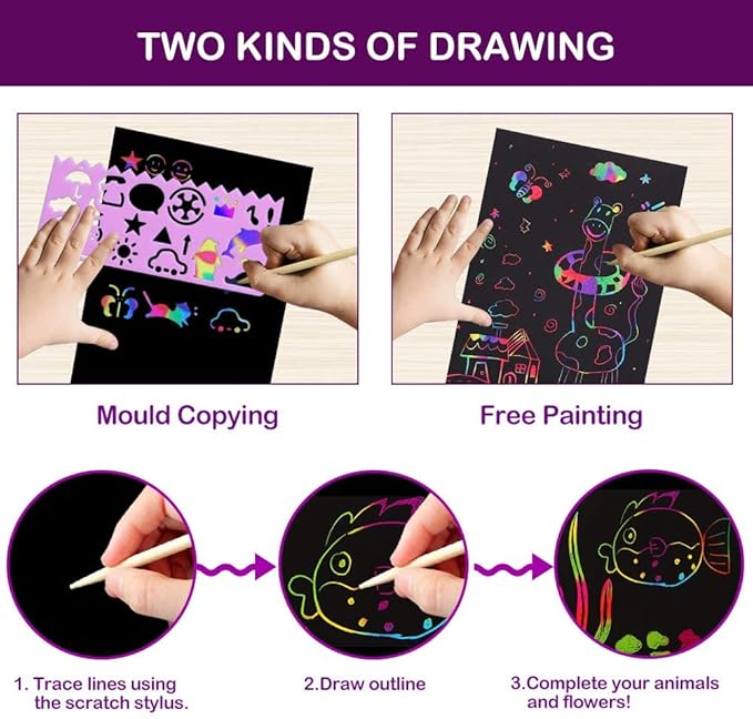 - EASY TO USE: Directly scratch the surface of black scratch off paper with the wooden stylus to reveal the amazing colorful patterns underneath. The scratch off art kit can increase visualization skills and creativity of children. It's a great way to encourage your kids to write fun notes and draw pictures for each other, and for friends and family.