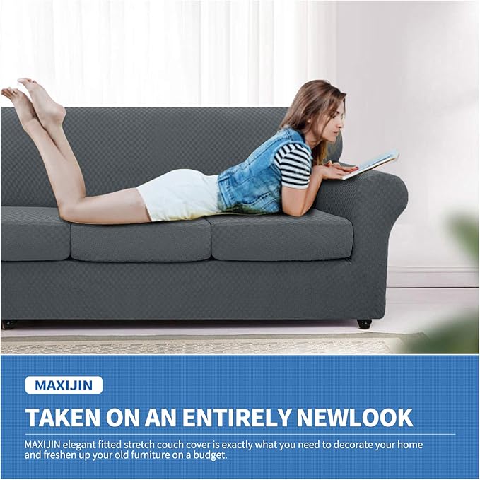 - 4 PIECES INCLUDED - MAXIJIN premium stretch sofa cover is exclusive designed for those couches with individual cushions, which includes one couch cover and three cushion covers, a Must-have magic sofa covers for 3 cushion couch! Because the seat cushions cover are separated, they will fit better, and not change the whole outlook of your couch, looks like a customized slip cover. And the strong elastic edge on bottom help secure the cover and ensure 100% NON-SLIP