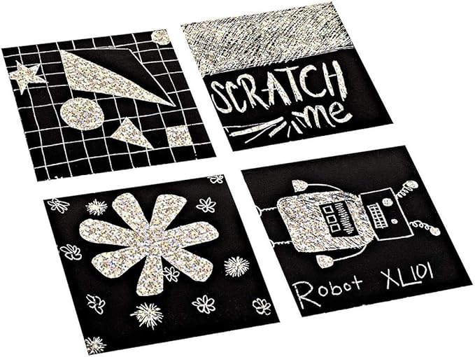 - 【Easy and Mess-Free Fun】Simply scratch off the black coating with the provided styluses to reveal vibrant rainbow or silver holographic colors underneath. This process is easy, fun, and mess-free, making it perfect for crafts, adult doodling, to-do lists, and even office memos. No paint required, just pure creative enjoyment.
