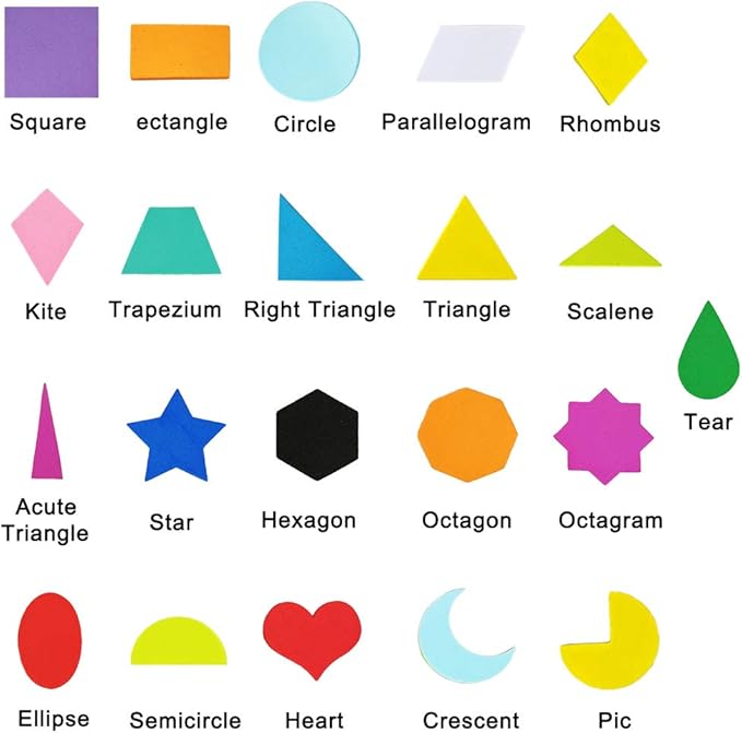 - Quantity:1035 Pcs 15 Colors 3 Sizes 22 Shape Bulk Foam Stickers Self-adhesive Foam Geometry Shapes Stickers Assortment,Including Square,Rectangle,Circle,Parallelogram, Rhombus,Kite,Trapezium, Right Triangle, Triangle, Scalene, Acute Triangle, Star, Hexagon, Octagon, Octagram, Ellipse, Semicircle, Heart, Crescent,Pic and Tear Drop Self-adhesive Foam Shape Stickers.