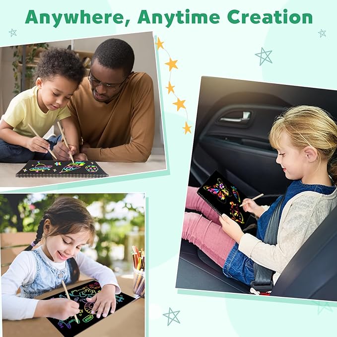 - Easy to Create & Clean: If you're a parent who doesn't like crayons and markers because they end up on your wall or dried out, then this scratch toy is for you! Just a stylus scratch off the black surface to reveal the colors underneath and then painting few lines to create more colorful pictures what your child imagine or want to creative