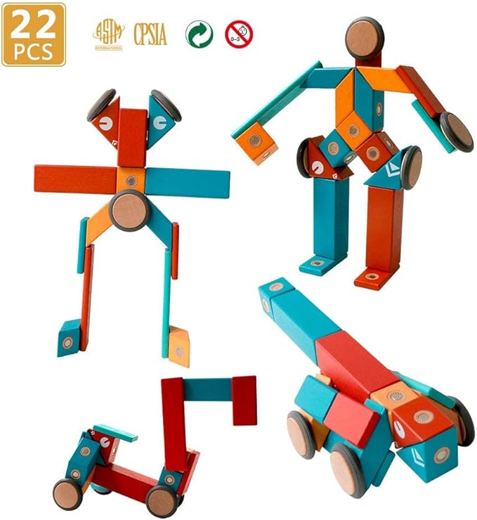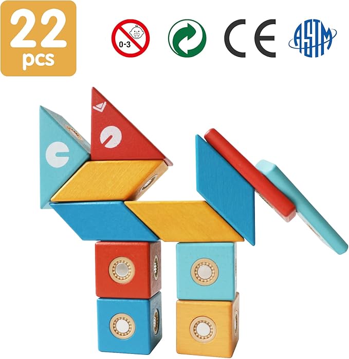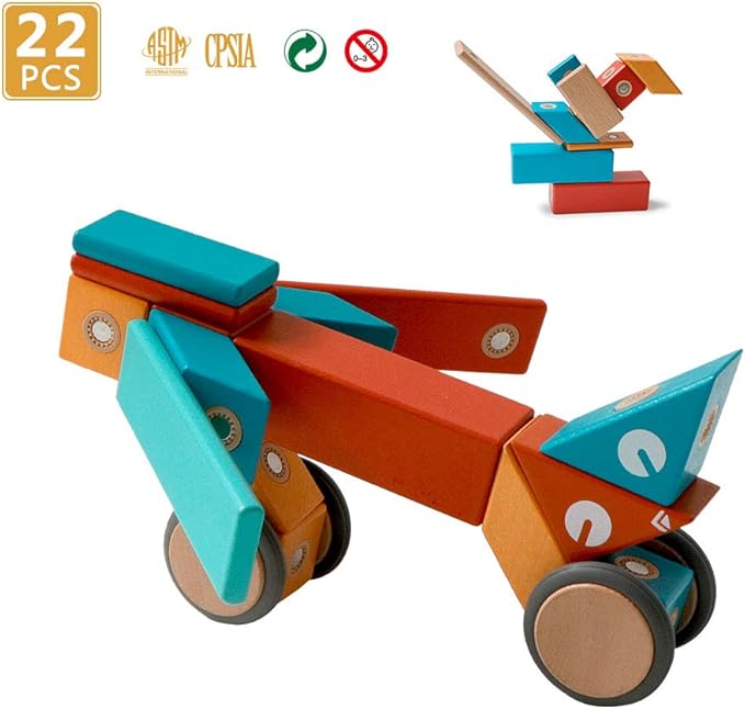 MAGBLOCK Magnetic Wooden Blocks Set, 22 Pieces STEM Travel Creativity Magnet Block Toys for 3 4 5 Year Old Age Girls Boys