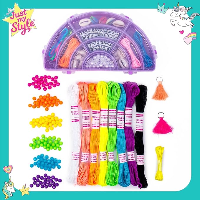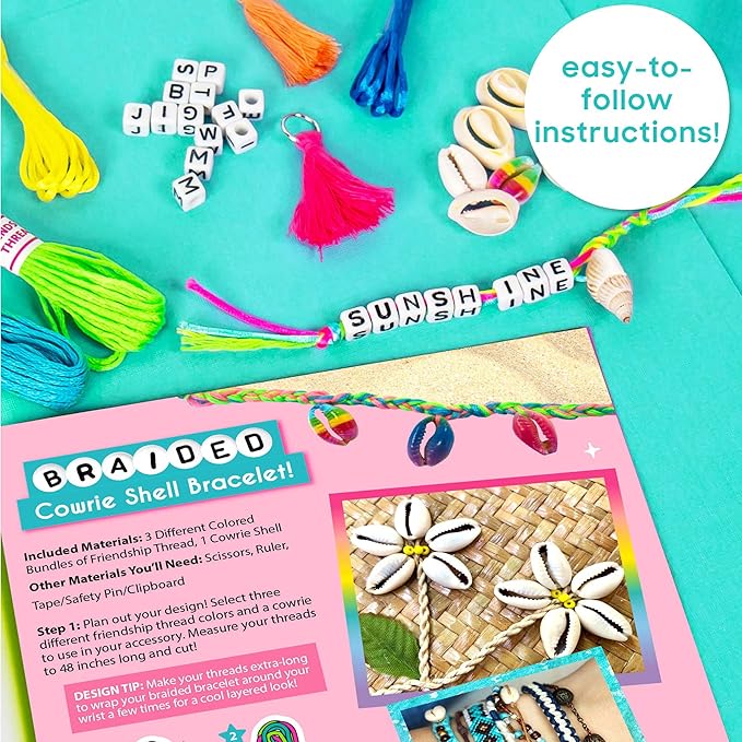- KIT INCLUDES: 150 Round Beads, 30 Pearl Beads, 42 Alphabet Beads, 18 Cowrie Shells, 2 Tassels, 1 Conch Shell, 1 Storage Case (6.22 x 3.58 in.), 8 Bundles Friendship Thread (Black, White, Neon Pink, Neon Yellow, Neon Green, Neon Purple, Neon Blue, Neon Orange), 5 Bundles Satin Cording (Pink, Blue, Yellow, Orange, Rainbow), Easy-to-Follow Instructions