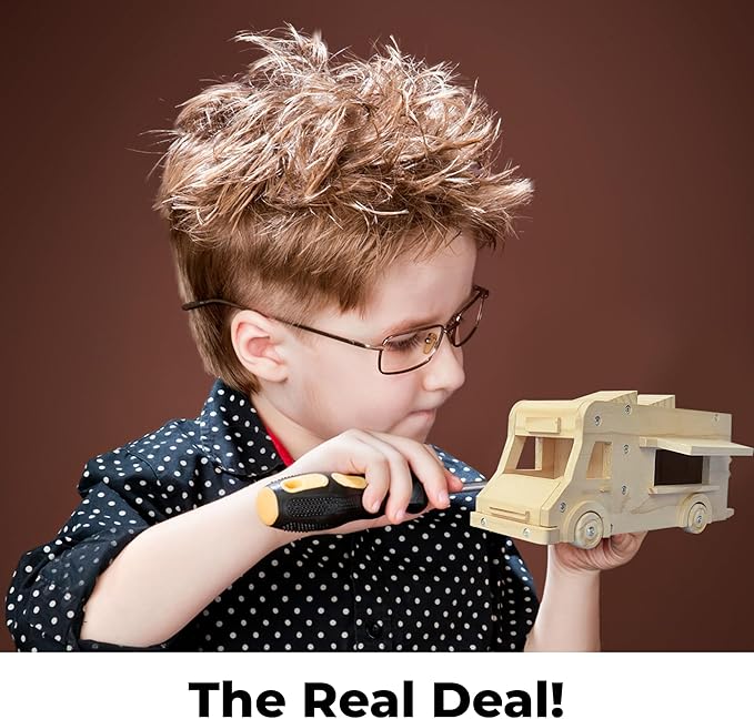 - The Real Deal! Real Wood and Real Tools, Not Just sticking everything together with glue. Wood Pieces are real- not foam or faux wood. Kids will love using the screwdriver and screws to put this together just like adult woodworking!