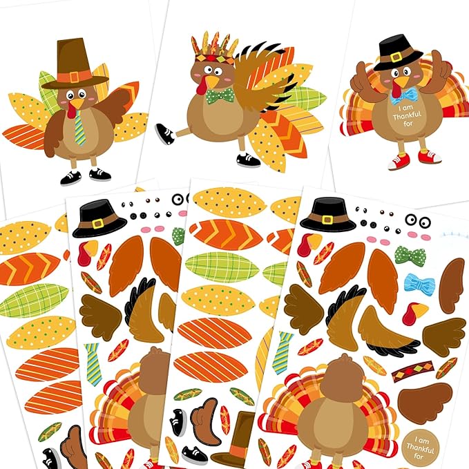 - Package Includes: 20 Make-A-Turkey sticker sheets. 2 designs, 10 of each. All the stickers are repositionable