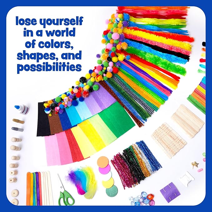 - Premium Value: Kit includes Pipe Cleaners, Fuzzy Sticks, Pom Poms, Wooden Pieces, Felt Strips, Craft Sticks, Sequins, Wooden Discs, Wooden Beads, Plastic Beads, Sticky Gems, Googly Eyes, Scissors, Sewing Needles, Glue, Glitter Glue, Feathers, Buttons, Thread.