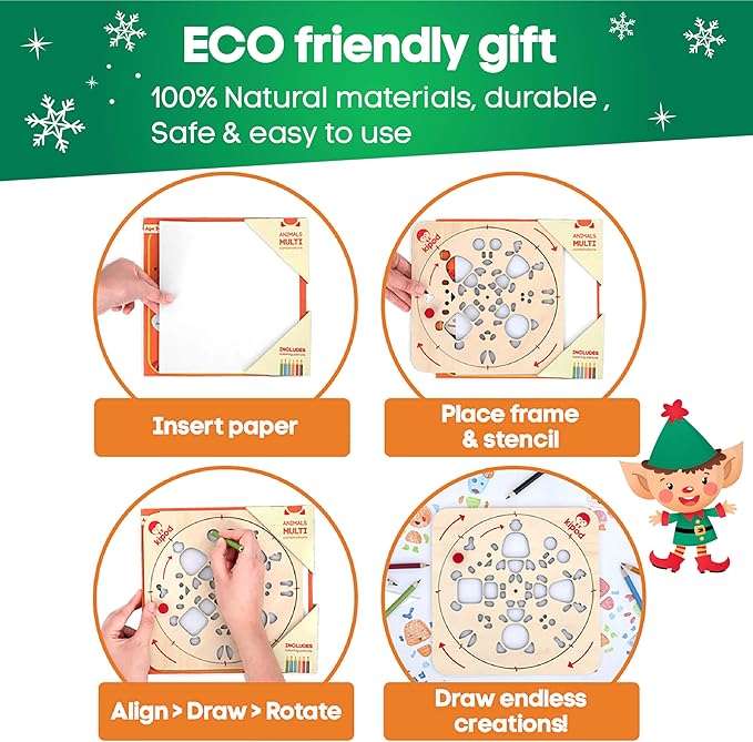 - SET TO STENCIL – Start stenciling upon arrival! Your shape stencil set includes 1 wooden stencil and frame, 6 colored pencils, and 5 pieces of paper. Plus, the packaging doubles as a drawing station!