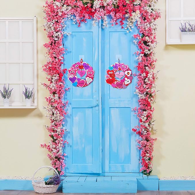 - Quantity: Heart Wreath Decorations DIY Foam Wreaths Craft Kit includes 12 pcs round foam wreath bases, 138 pcs heart foam stickers feature assorted patterns, 48 pcs heart foam stickers in 4 solid colors, 24 pcs glitter heart foam stickers in 2 colors, 12 pcs foam heart tags in 3 colors, 72 pcs black googly eyes, 12 pcs satin cords in 5 colors, 1 sheet of rhinestone stickers, 12 pcs adhesive wall hooks, and 1 pcs black marker pen.