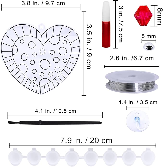 • 27 Sets Heart Suncatchers Ornaments Decoration DIY Craft Kits, including 27 pcs heart suncatchers in 9 styles, 300 pcs acrylic beads, 20 bottles of 8 valentine colors acrylic paints (6ml per bottle), 27 pcs paintbrushes, 1 empty paint pot strip with 8 pots, 20 pcs googly eyes, 27 pcs suction hooks, 1 roll fishing thread. Each suncatcher comes with a small loop on the top that can be used to create a hanger. With all in one package, kids can enjoy the DIY project conveniently.