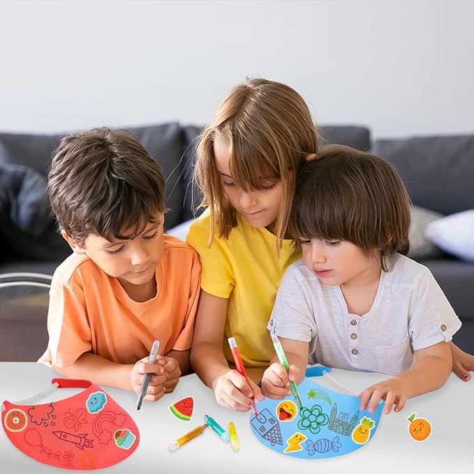 - KEEP COOL THIS SUMMER – Kids over the age of 3+ years will love to decorate and wear these foam visors. It will also keep the sun out of their eyes when playing outside this summer. It has adjustable coil band enclosure. It measures 7"x 6.5”. Great for Kids’ Fun Arts & Crafts Project.
