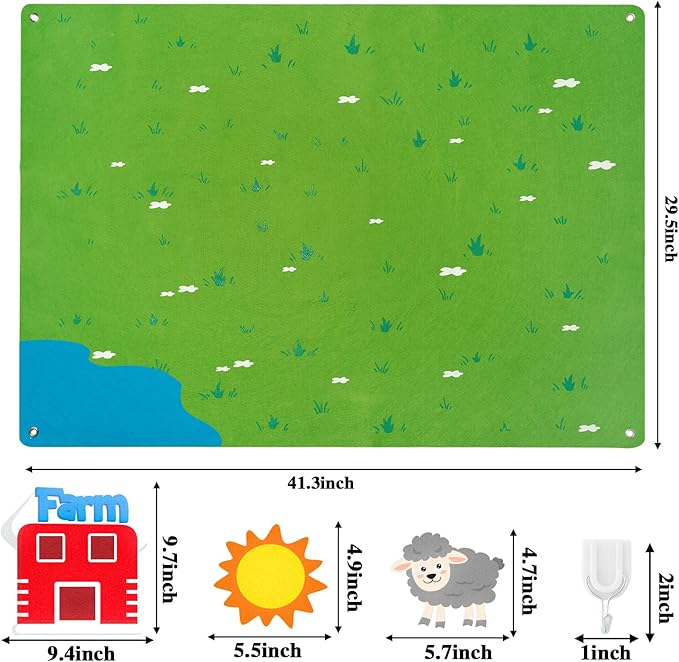 - FARM THEMED TEACHING TOYS KIT: Giant 3.5 feet domestic animals felt toy kit with 33 felt pieces comfortable size for little hands. These interactive felt pieces could be moved repeatedly on the felt board. With 4 sturdy hooks attached, the large felt background board can be easily hung.