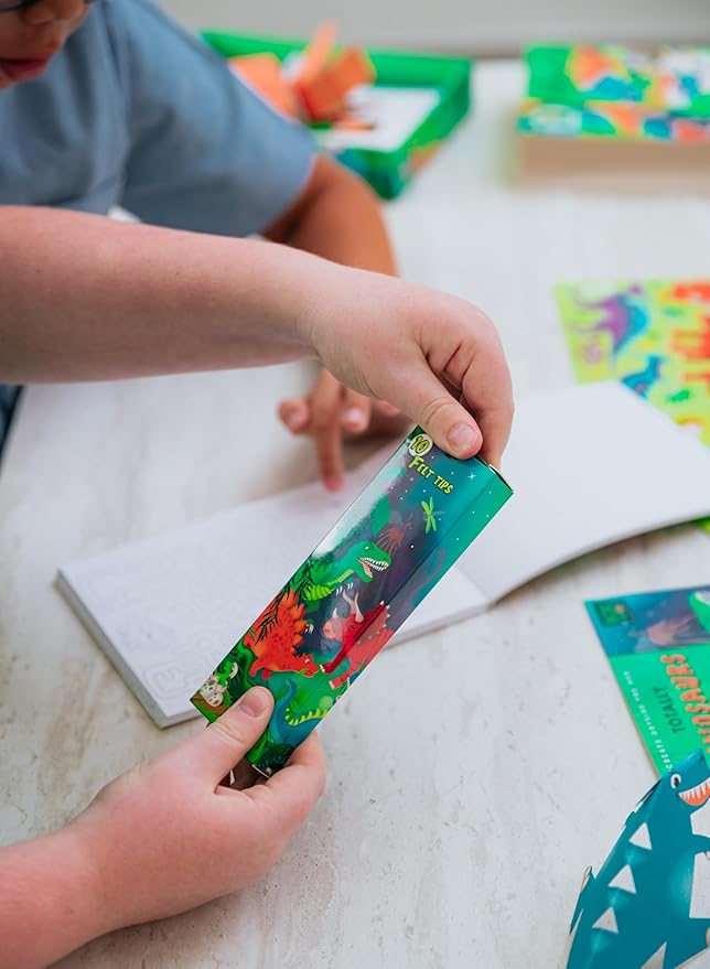 - Complete set includes a dinosaur activity book with 30 tear-off activity pages, 2 sticker sheets, 8 color markers and instruction leaflet; For ages 6 years and older