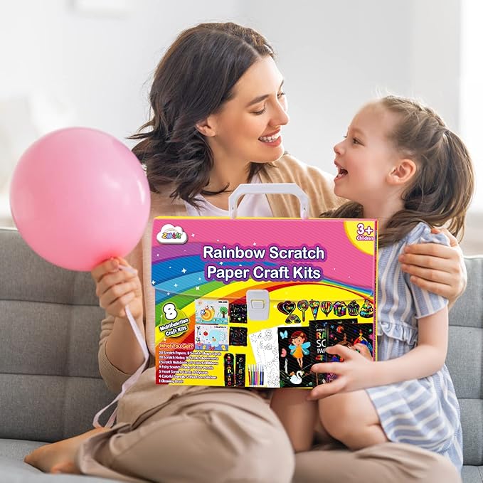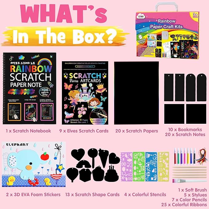 - 🎁Super Value Art Craft Sets: ZMLM girl gifts box Includes 117 pieces for kids to create designs: scratch notebook/ scratch papers/ 3D Foam Stickers/ Elves Cards/ Bookmarks/ Note cards/ Shape cards/Heart Cards/ Colorful Stencils/ Color Pencils/ Colorful Ribbons and a Soft Brush easy to clean. The girl craft gifts can be stored in a beautiful gift box