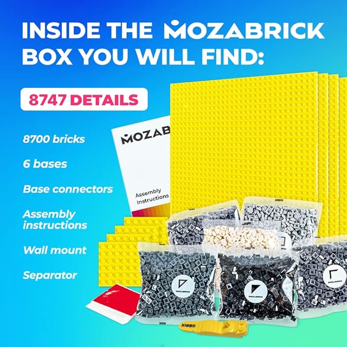 - WHAT YOU WILL GET: MODEL L set includes: 8700 bricks in 5 monochrome colors; 6 base plates to assemble the pixel art; 18 baseplate connectors; 1 mounting tool; double-sided tape for wall mounting; 1 Instruction, 1 CODE for unlimited mosaic picture generation. The code can be linked to up to 5 email addresses and can be used unlimited times to regenerate your pixel art – regardless if you are using a new or already used picture.