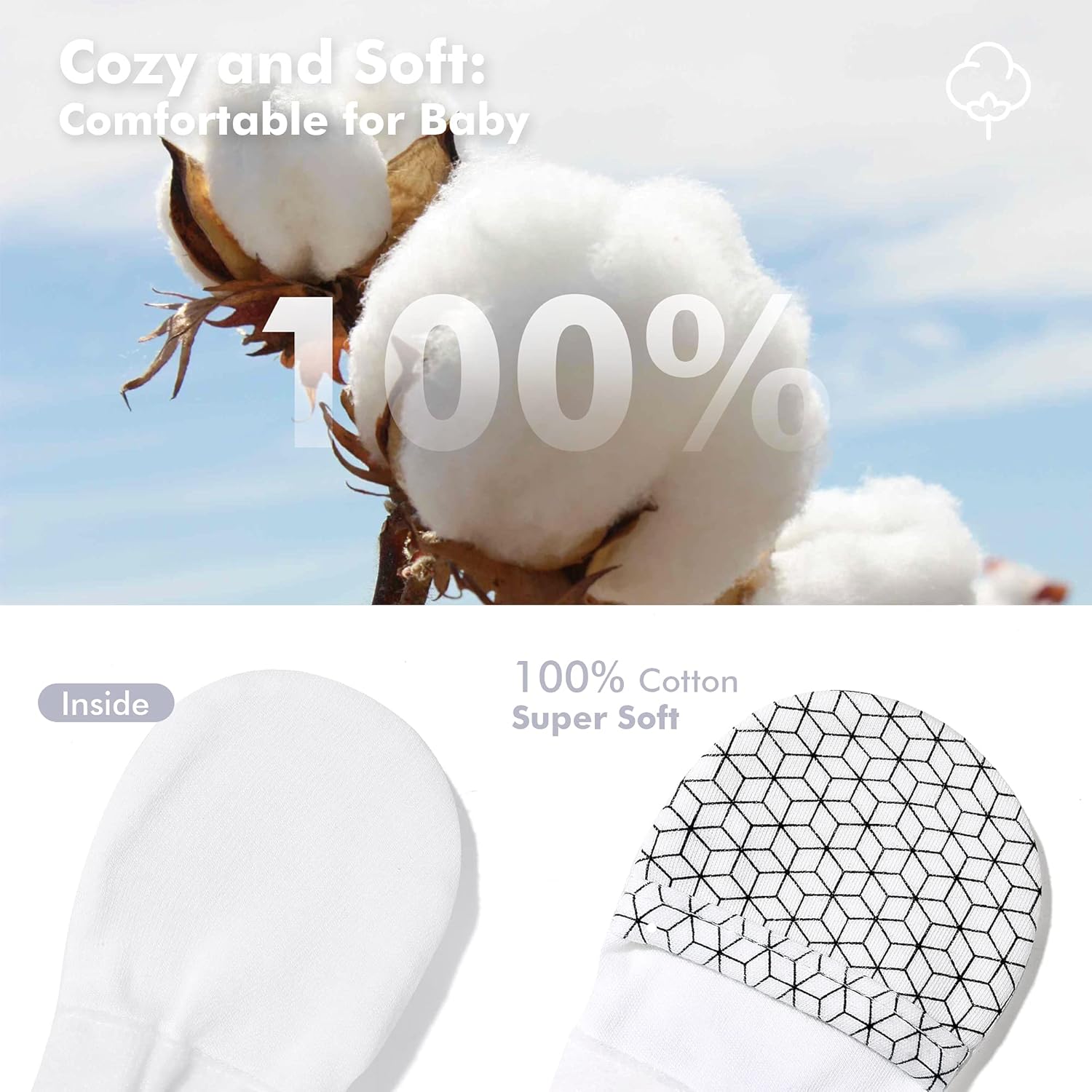 HAPIU Baby No Scratch Mittens Stay On, 100% Cotton Breathable, Adjustable Infant Gloves for Boys Girls, Newborn - 12 M