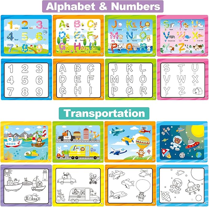 - Water drawing books encourage kids to trace and learn the hidden alphabet letters, numbers and animals through seek-and-find game by water coloring to develop basic perception of reading,imagination and visual discrimination.