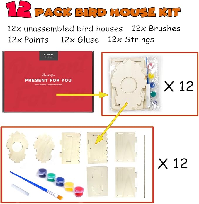 - Complete Birdhouse Kit: This package includes 12 unassembled birdhouses, 12 x 5 paint colors, 12 brushes, 12 strings—everything you need to build and decorate your own birdhouses.
