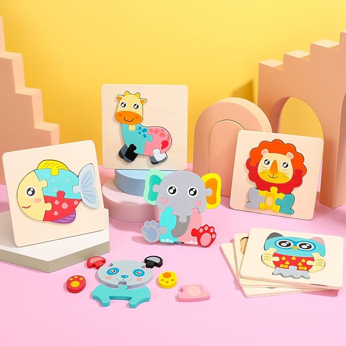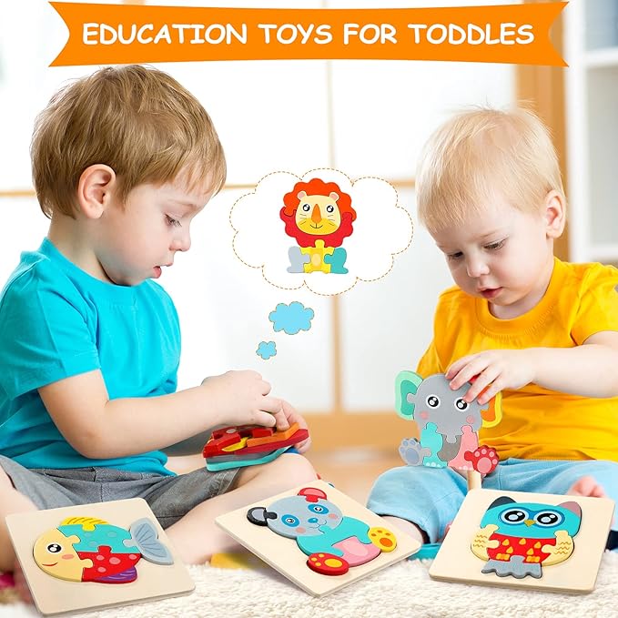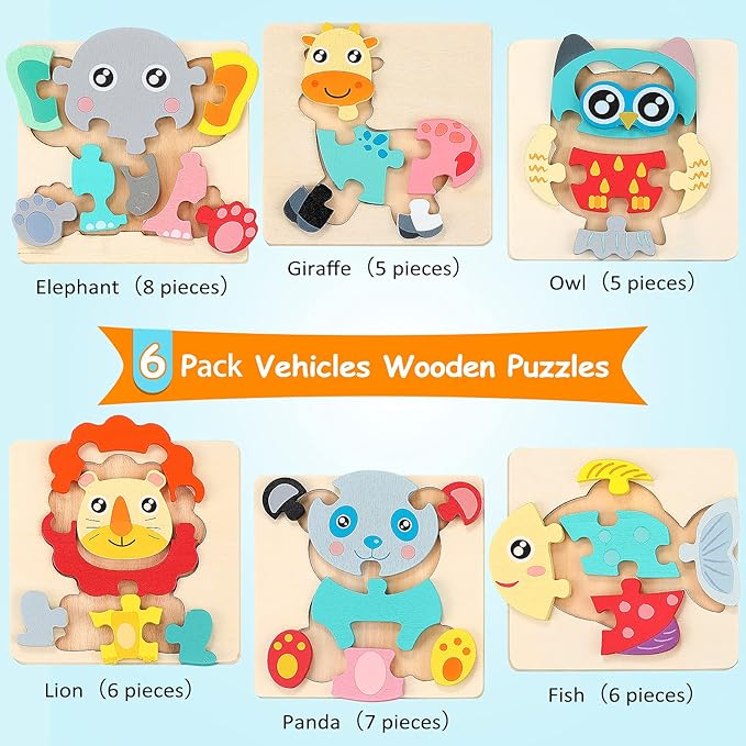 6 Pack Wooden Puzzles for Toddler 1-3 Years Old Wood Jigsaw Puzzles for Boys Montessori Games and Educational Toys for Kids Wooden Toddler Puzzles Present (Animal)