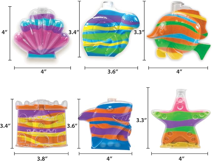 - 6 FUN-SHAPED BOTTLES: Seashell, sand castle, turtle, fish, shark, starfish — this DIY sand art kit comes with 6 bottles in different shapes & sizes!