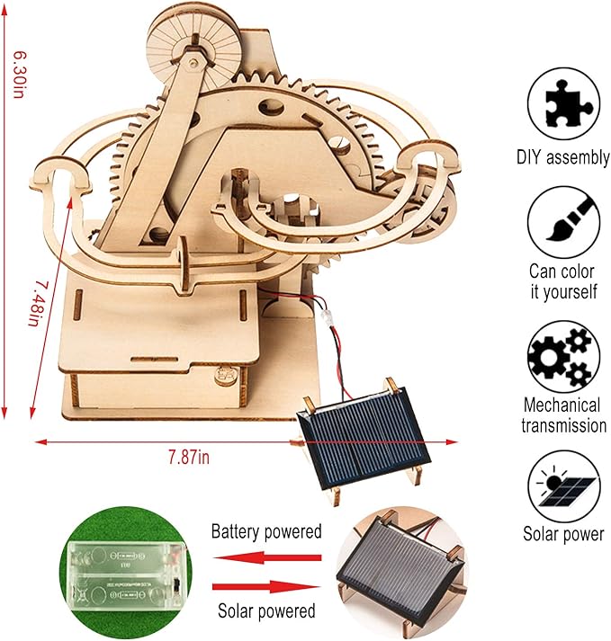 - Powerd by Solar Panel or Battery : Build your own marble run by battery or solar. Requires 2 AA batteries (batteries is not included in the package),Wooden 3D puzzle toy is pure entertainment meets learning.